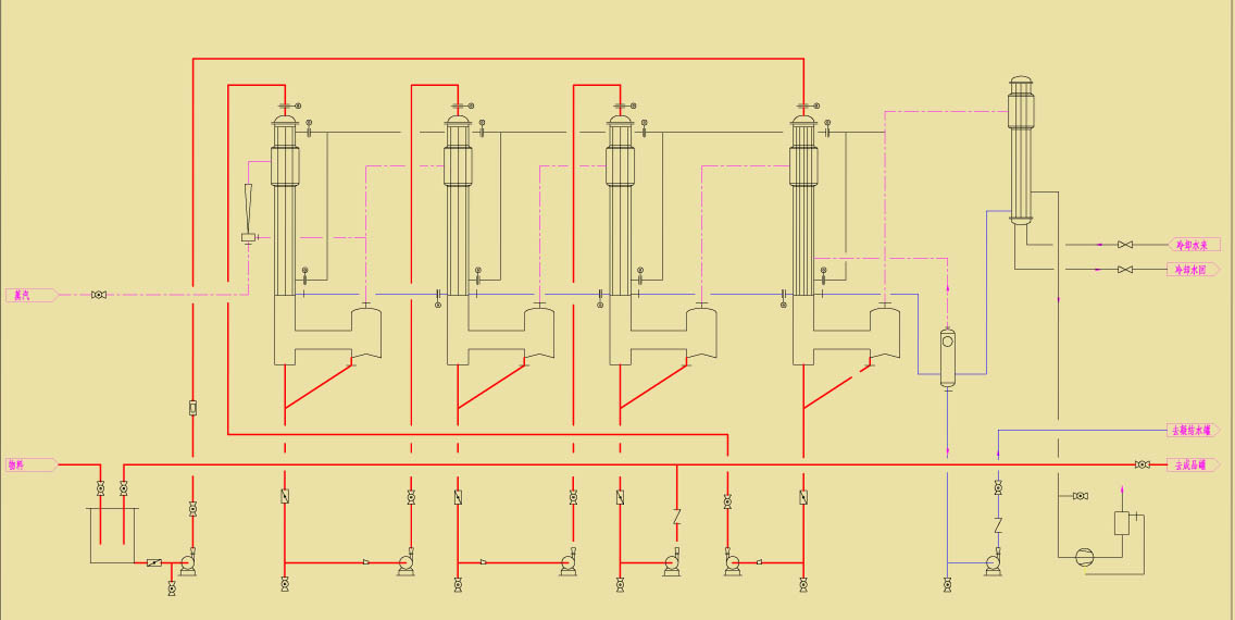 在降膜式蒸發(fā)器中,液體和蒸發(fā)汽向下并流流動(dòng);物料在沸點(diǎn)溫度下進(jìn)入蒸發(fā)器,通過(guò)蒸發(fā)器頂部的液體分布裝置,均勻地沿加熱管壁成膜狀向下流,在向下流的過(guò)程中不斷的蒸發(fā),不斷地被管外的蒸汽加熱。降膜蒸發(fā)器具有傳熱系數(shù)大,物料在加熱過(guò)程中由于停留時(shí)間短而變性小等特點(diǎn)。降膜蒸發(fā)器廣泛應(yīng)用化學(xué)、制藥、天然有機(jī)產(chǎn)品和食品工業(yè)等。降膜式蒸發(fā)器還具有開車快捷、容易切換至清洗操作模式或濃縮另一種產(chǎn)品、適應(yīng)能力強(qiáng)、可控性好、能耗低等強(qiáng)大優(yōu)勢(shì);可以預(yù)見降膜式蒸發(fā)器將在眾多應(yīng)用領(lǐng)域替代其它類型的蒸發(fā)裝置并將不斷完善。